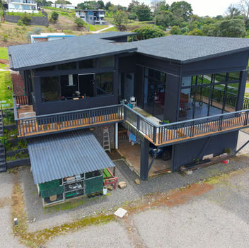 and the adjacent coffee farm, with several expansive glass windows that invite the outdoors in. Sliding
